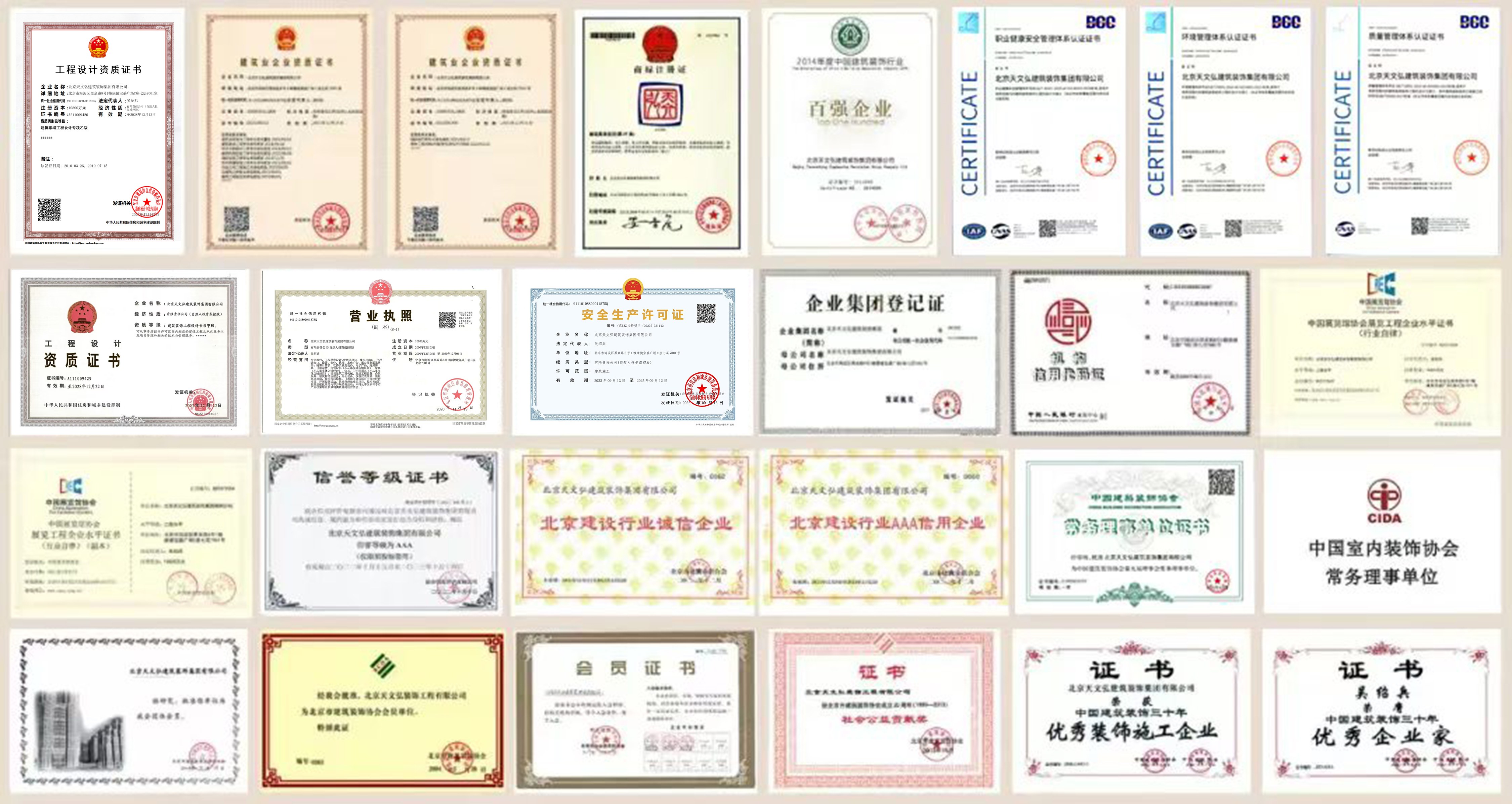 北京天文弘建筑裝飾集團(tuán)有限公司,始創(chuàng)于1995年,正式成立于2000年,注冊資本10800萬元??偛课挥诒本┦泻5韰^(qū)寶盛廣場。是建設(shè)部核準(zhǔn)的國家建筑裝飾設(shè)計甲級資質(zhì)、 施工壹級資質(zhì)的企業(yè);同時具有建筑工程施工總承包貳級、市政公用工程施工總承包貳級、建筑幕墻工程設(shè)計乙級、施工貳級、電子與智能化工程專業(yè)承包貳級、建筑機(jī)電安裝工程專 業(yè)承包貳級、消防設(shè)施工程專業(yè)承包貳級、防水防腐保溫工程專業(yè)承包貳級、古建筑工程專 業(yè)承包貳級、展覽陳列工程設(shè)計與施工一體化資質(zhì)壹級、特種工程及鋼結(jié)構(gòu)等多項資質(zhì)。連 續(xù)多年通過了ISO9001質(zhì)量管理體系、ISO14001 環(huán)境管理體系、ISO28001職業(yè)健康安全管理體系認(rèn)證?,F(xiàn)為阿里巴巴經(jīng)濟(jì)體優(yōu)秀供應(yīng)商、融創(chuàng)·中國戰(zhàn)略合作伙伴、中國建筑裝飾協(xié)會常務(wù)理事單位、北京市建筑裝飾協(xié)會副會長單位、中國建筑裝飾行業(yè)百強(qiáng)企業(yè)。是中央國家機(jī)關(guān)2011-2025年度工程項目定點(diǎn)施工企業(yè)。